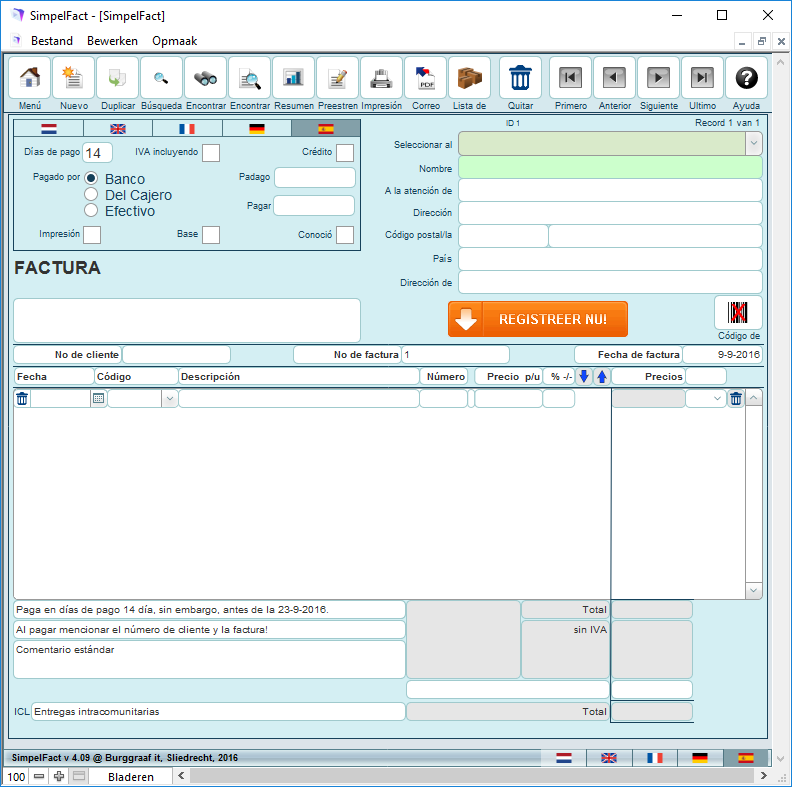 SimpelFact tiene las siguientes opciones para Inglés, holandés, alemán, francés y español.